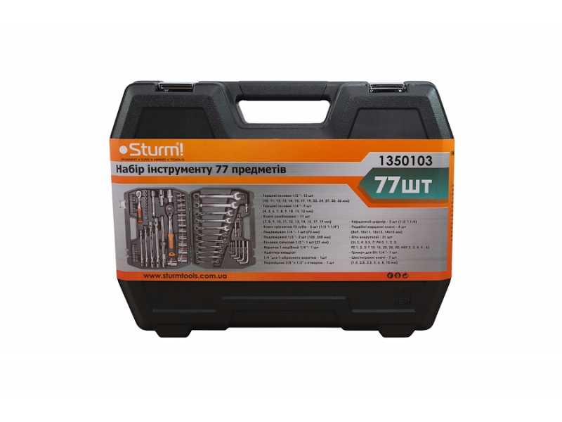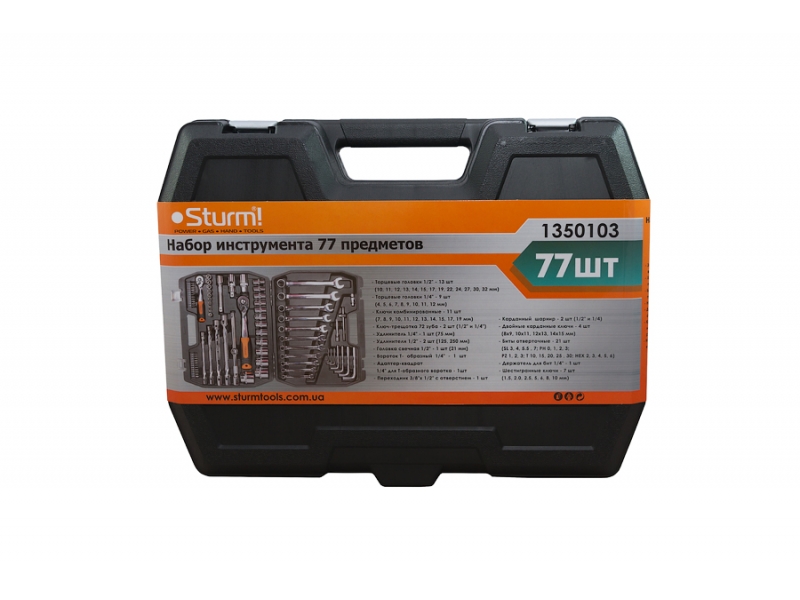 Набор инструментов Sturm 1350103 потребуется во время выполнения различных видов работ. Автоинструмент будет незаменимым в автомастерских, автосервисах, СТО. Ручной инструмент выполнен из хром-ванадиевой стали и соответствует сертификатам качества. Набор состоит из 77 единиц инструмента. Кейс изготовлен из прочного пластика с металлическими замками.