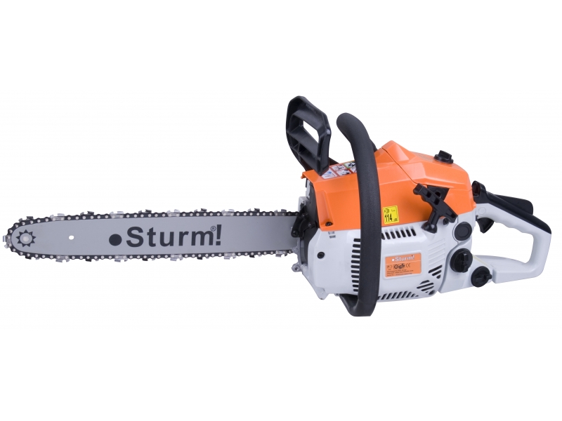 Пила бензиновая Sturm! GC9937B - простой для освоения, один из самых легких в линейке пил Sturm!, доступный по цене инструмент бытового уровня. Предназначен для заготовки дров, резки сучьев и спиливания небольших деревьев (диаметром до 38 см), оптимально подходит для любителей поработать на дачном участке или в саду. Устанавливается пильная шина длиной 18 дюймов. Шаг цепи 0,325 дюйма, скорость вращения в режиме холостого хода 2600 об/мин. В пиле Sturm! GC9937B установлен бензиновый 2-х тактный двигатель мощностью 2,4 л. с с воздушным охлаждением. Для увеличения срока службы инструмента и улучшения рабочих характеристик внутренние стенки цилиндра хромированы, применяется электронное зажигание и система автоматической смазки цепи. Создателями предусмотрена возможность работать с пилой при температуре до -30°С. Для облегчения запуска холодного двигателя установлен праймер (насос для подкачки топлива). Система мгновенной остановки цепи и предохраняющая от непроизвольного включения кнопка обеспечивают безопасность для пользователя при работе с бензопилой Sturm! GC9937B. Инструмент и комплектующие поставляются в картонном коробе.